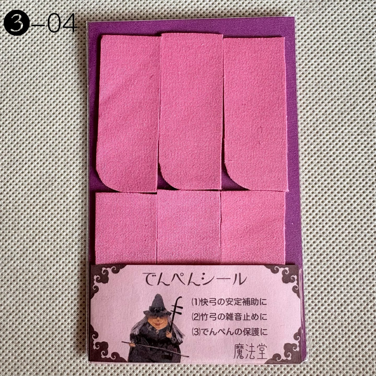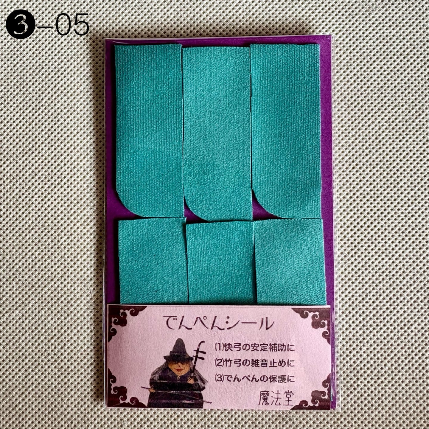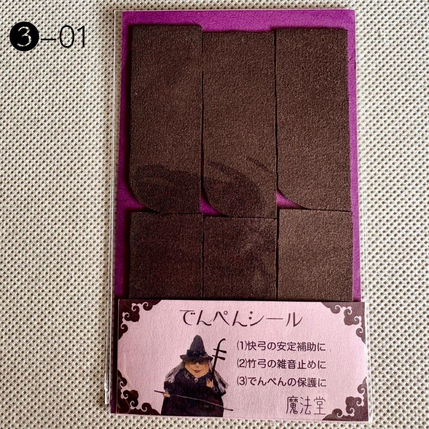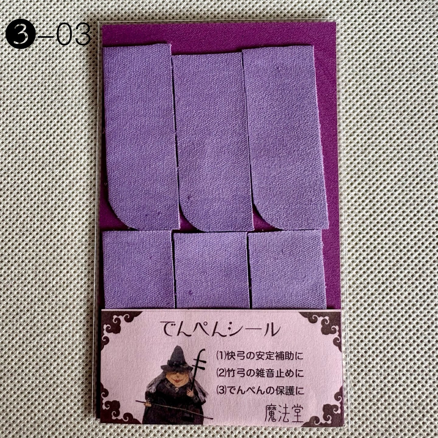 本来はデンペンのすり減りを防ぐためのシールですが、弓竹がデンペンに当たった際に出るカチカチとした雑音止めの効果に加え、慢弓・特に快弓の演奏が安定しやすくなります。