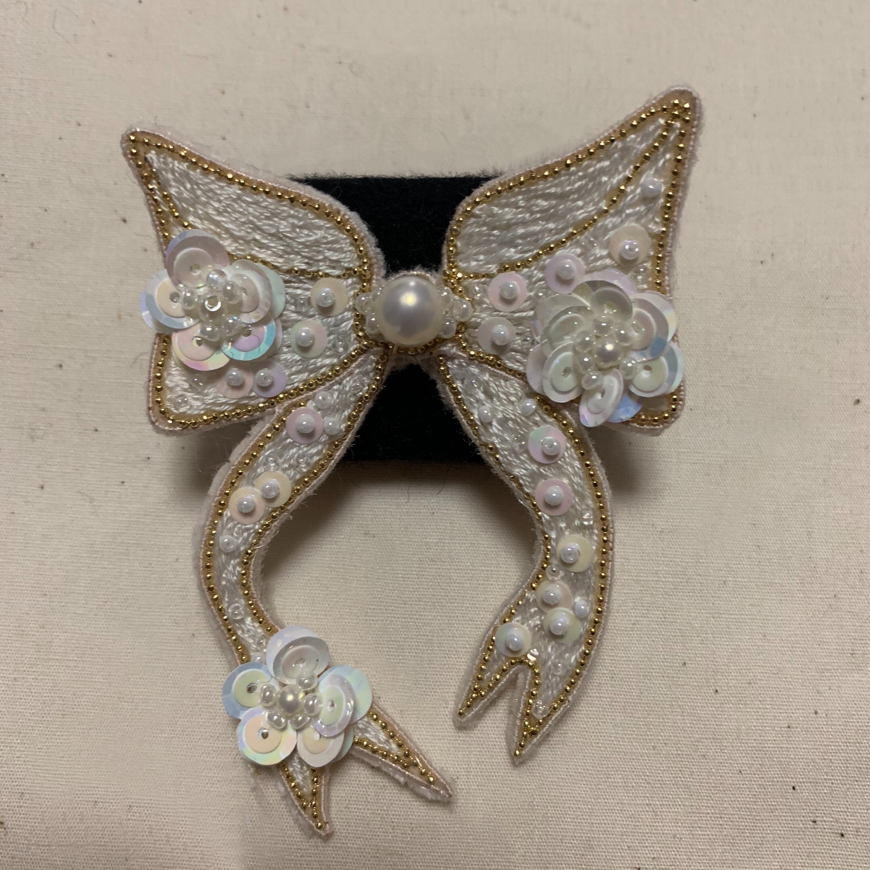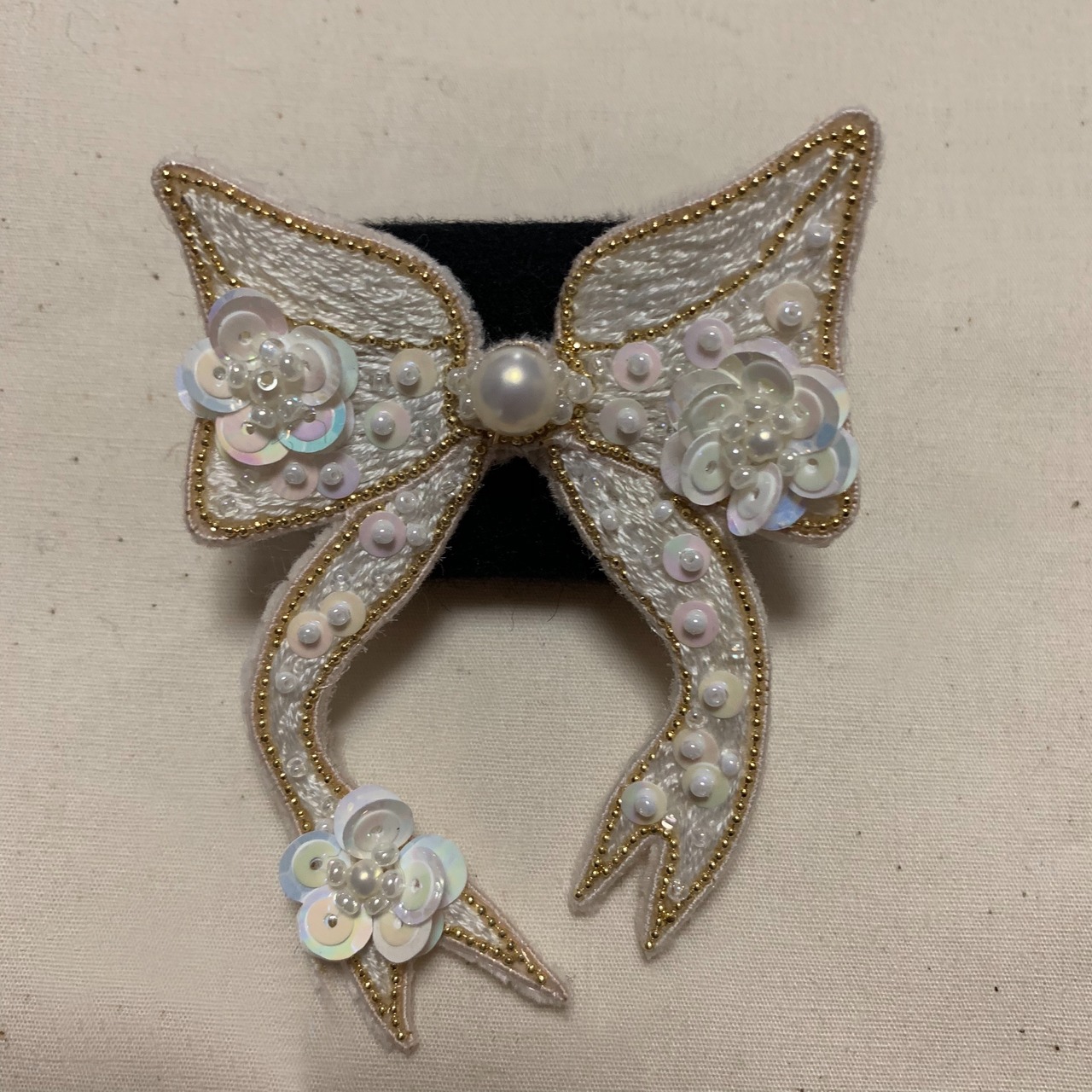 縁取のゴールドと大小のパールとスパンコールがバランス良く配置されていて上品に輝いています。