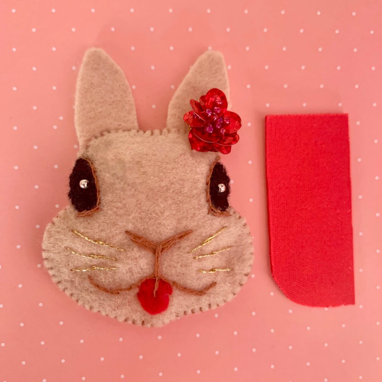 二胡の音色調整、雑音除去用、赤いスパンコールのお花で飾った肌色ウサギのコントロールマスコット(控制塾)と、デンペンシール1枚(赤・ベージュのどちらか)のセットです。