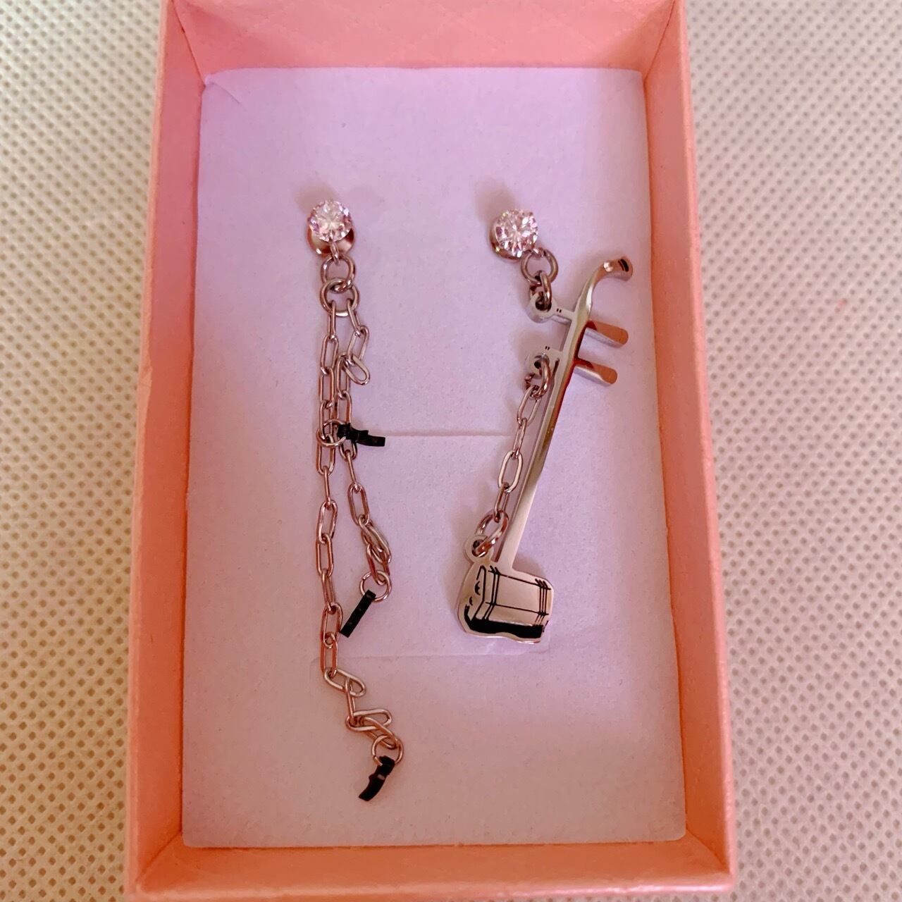 耳たぶの位置にイミテーションダイヤを1粒用い、その下にはチタン銅で造られた二胡と、もう片方は2連のチェーンで装飾されています。