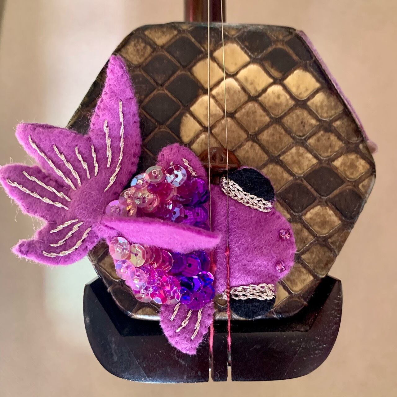 水の中を泳いでいる様なフォルムを意識してデザインした出目金のコントロールマスコットです。紫のフェルトに3色の紫スパンコールを縫い付けました。ヒレ、目の周りは銀の刺繍糸、鼻は紫色のビーズを使用しています。中には肌理の細かい化粧用高級スポンジを入れています。二胡の音色調整、雑音除去用、紫出目金魚のコントロールマスコット(控制塾)と、同色のデンペンシール1枚とビーズを通した蝋引き千斤(120㎝)の3点セットです。