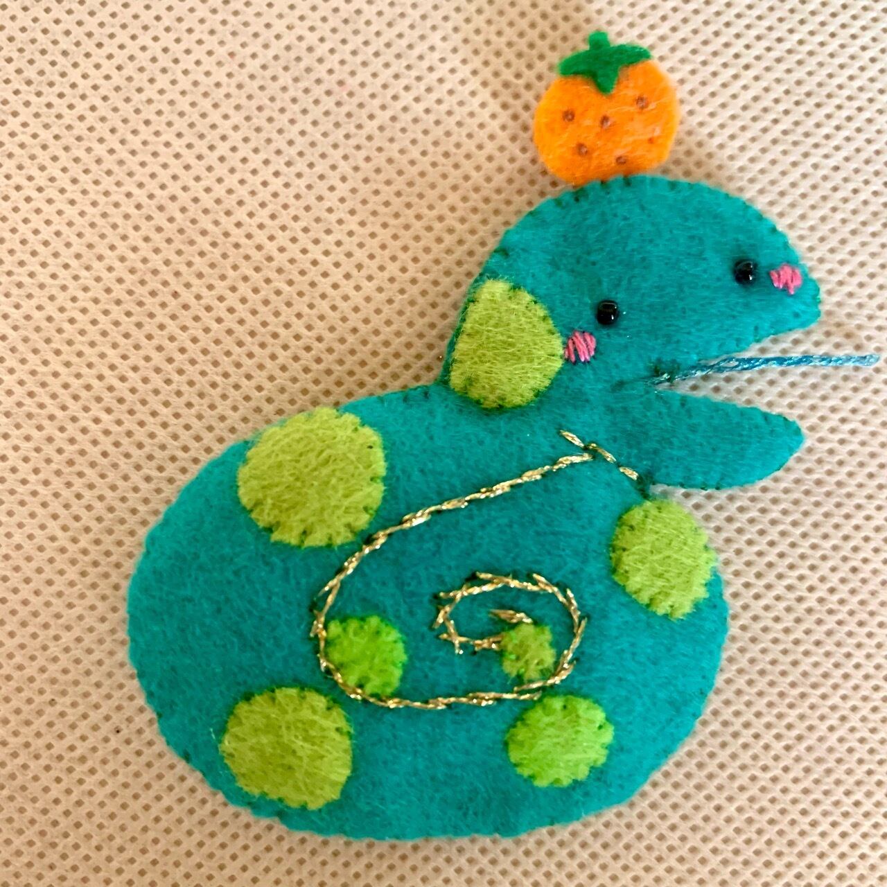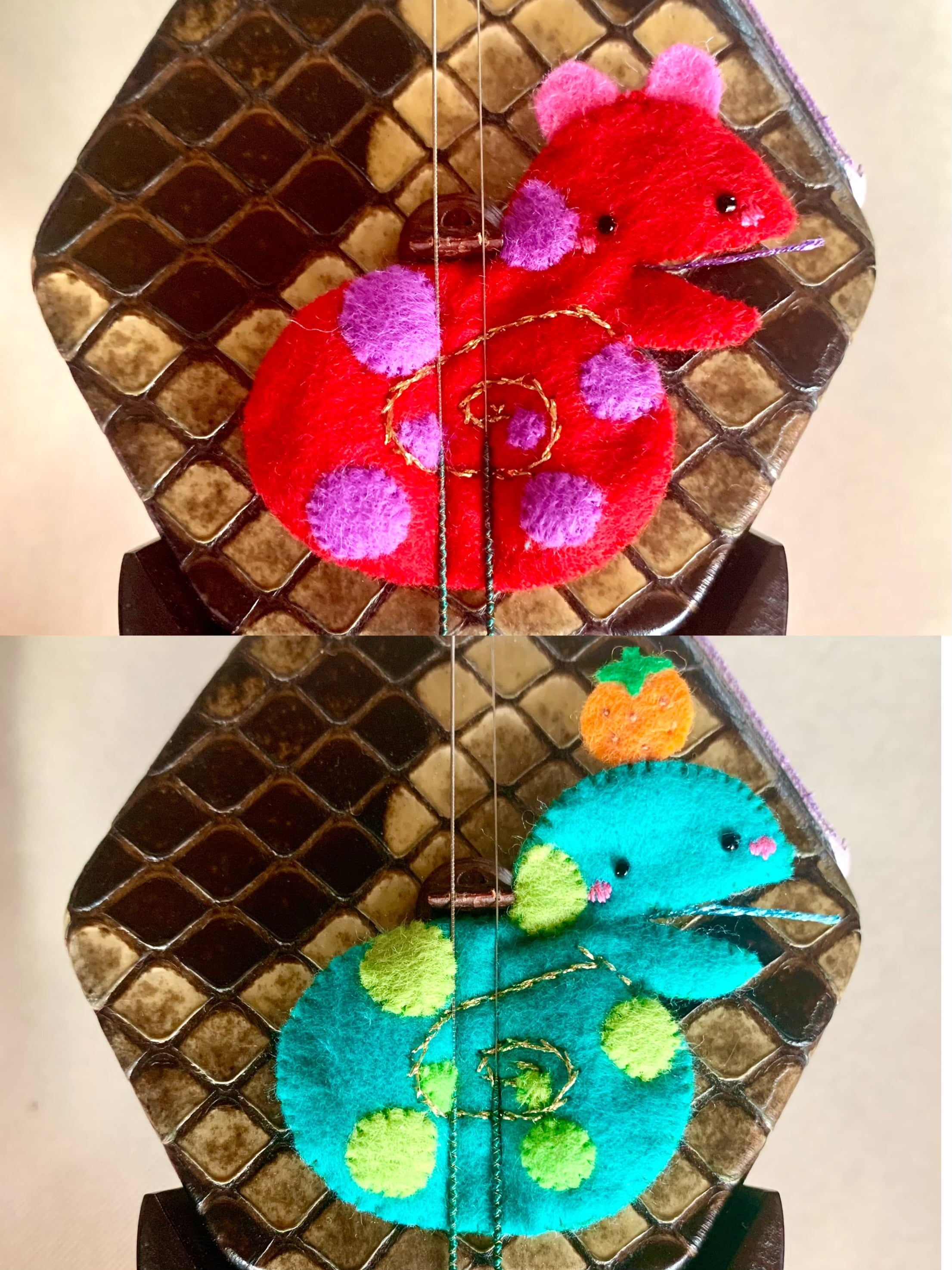 二胡の音色調整、雑音除去用、今年の干支、へびのコントロールマスコット(控制塾)です。中心部分に肌理の細かい化粧用高級スポンジを入れています。スポンジとフェルトを組み合わせることによって柔らかい音色を作ります。
